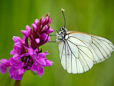 Die Reise in die Pyrenäen Anfang Juni fiel in eine Hitzewelle mit Temperaturen von manchmal an die 40° Celsius. Auch die Monate zuvor waren erheblich zu warm und vor allem zu trocken, so dass einige der eigentlich vorgesehenen Exkursionsziele der tieferen Lagen gar nicht angesteuert wurden, da dort anstatt blühender Orchideenwiesen nur noch verdorrte Vegetation zu finden gewesen wäre – die Vegetation war mindestens drei Wochen weiter als in normalen Jahren. Stattdessen wurde der Großteil der Reise in die Hochlagen der Pyrenäen verlagert, wo die Temperaturen noch einigermaßen erträglich und die Vegetation noch nicht so extrem weit fortgeschritten war. Dort konnten dann auch viele schöne Beobachtungen gemacht werden, etwa in orchideenreichen Quellmooren, auf bunten Bergwiesen oder in Bergwäldern. Obwohl von Ragwurzen und anderen frühen Orchideen nichts mehr zu sehen war, konnten doch immerhin noch 26 Orchideenarten und zwei Hybriden notiert werden. In bleibender Erinnerung werden die Mengen an Gänsegeiern bleiben, die nahezu allgegenwärtig waren. Doch auch Schmutzgeier und sogar Bartgeier konnten beobachtet werden. Auch typische Singvögel des Hochgebirges wie Steinrötel und Ringdrosseln ließen sich blicken. Als besonders erwähnenswerte Tagfalterarten können unter den über 80 beobachteten Arten unter anderem Schwarzer Apollo, Kardinal, Spanisches Ochsenauge, Saumfleck-Perlmutterfalter, Alpen-Mohrenfalter oder auch der Weiße Waldportier hervorgehoben werden. Letzterer konnte neben vielen weiteren Arten regelmäßig auf der blütenreichen Wiese direkt an der Unterkunft beobachtet werden.